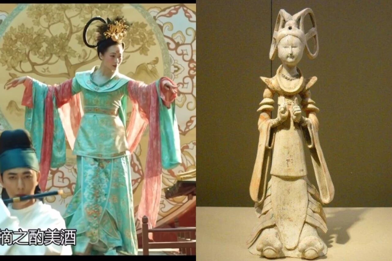 小到男人的胡须、头饰,街头花车斗彩女艺人的发型,皆有其对应唐时期的古画和泥塑版本。