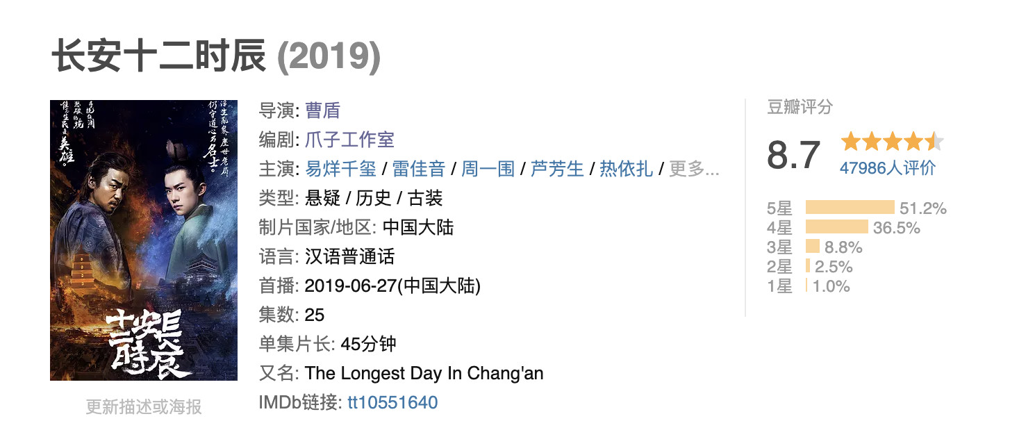 目前光豆瓣就有近5万名观众给《长安十二时辰》打出了8.7分的高分。