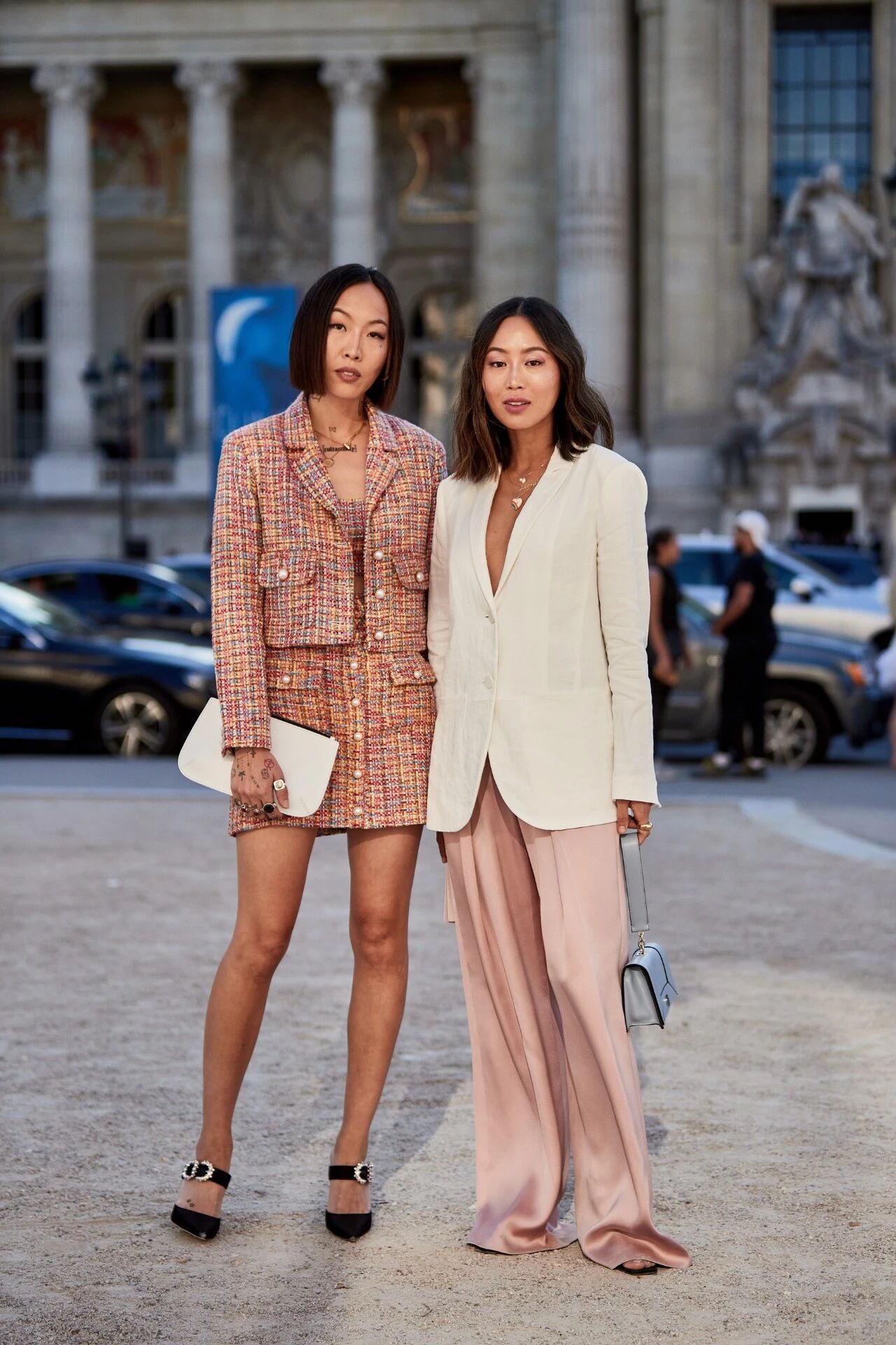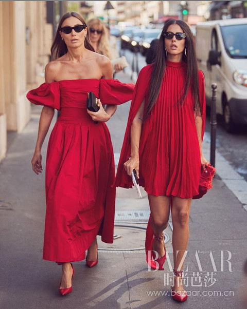 在高定秀场外,两位博主都选择了经典的华伦天奴红,完尽管完全相同颜色很难逃脱上世纪90年代的情侣Logo T特效。但是当你懂得和闺蜜选择不同款式或者不同材质的服装时,恭喜你,你已经喜提王者玩家称号。