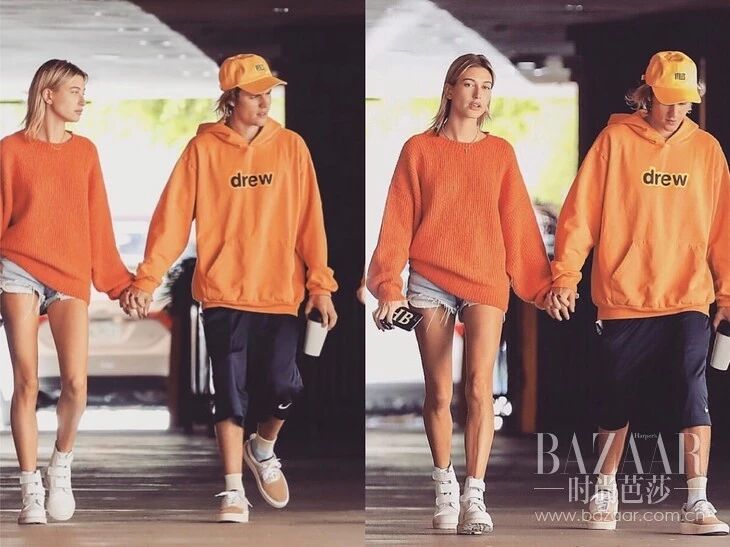 对于热爱街头风格的人来说,Justin Bieber和Hailey Bieber这一对是很好的范本,两人选择相同的橙色上衣,一个毛衣一个卫衣完全不会雷同,是很好的情侣街拍了。