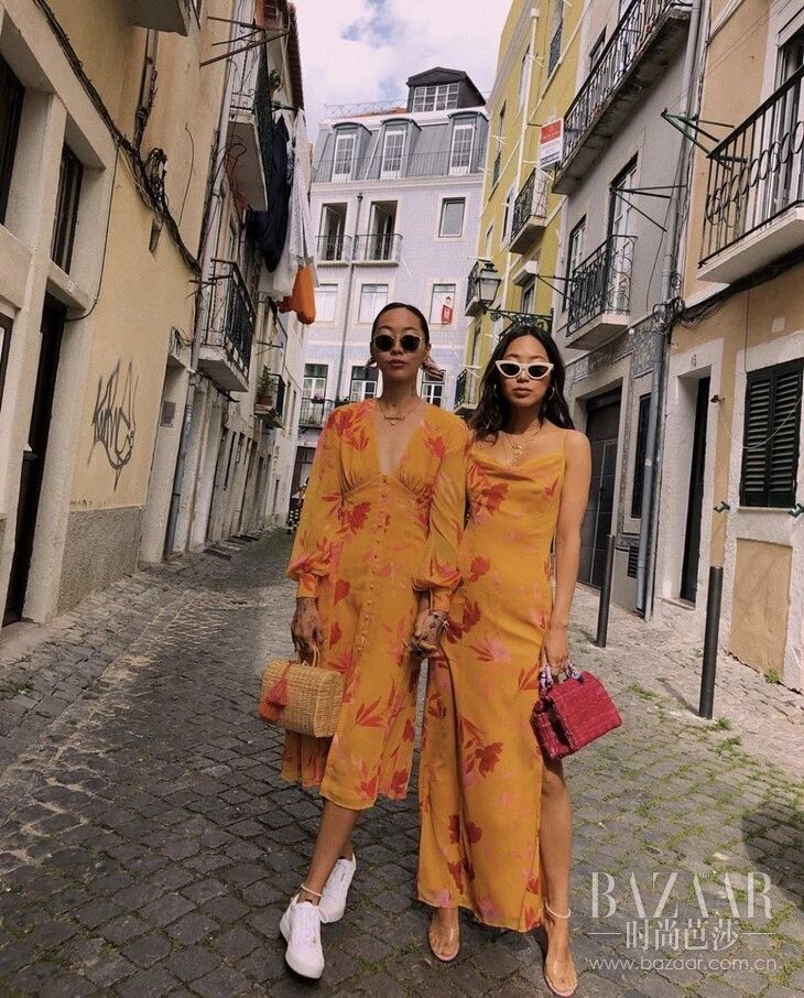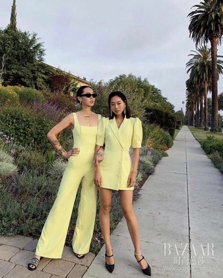 同样喜欢穿相同颜色出街的还有Dani Song和Aimee Song这对亲姐妹,作为走在潮流浪尖上的人儿,穿起姐妹装来是得心应手。两人黝黑的加州肤色与明亮的嫩黄色一起真的好夏天,但连体裤装和西服裙装却展现了不一样的个性和气质。