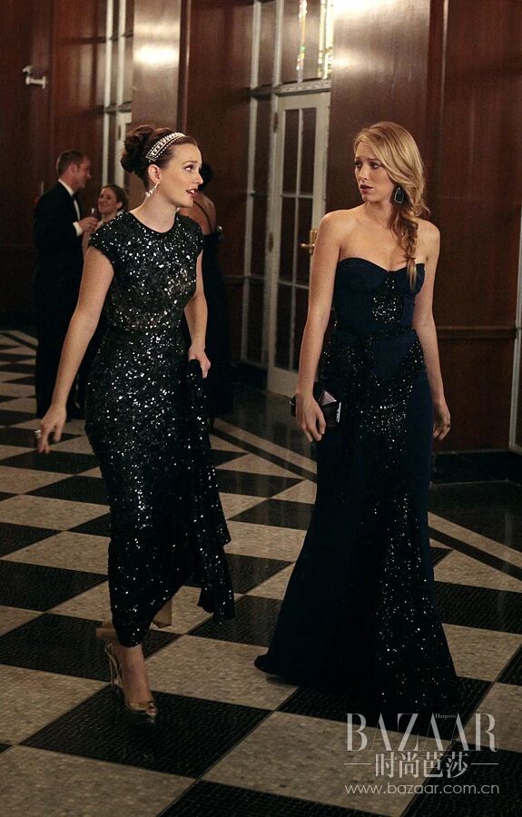 两人在派对上也会选择带有相同元素的造型,十分Match。搭配闪亮的亮片钉珠,公主心的Blair依旧离不开甜美的发箍,BlingBling的设计与裙装呼应得刚刚好。而Queen S则是无时无刻地展现着自己的好身段,通过一副夸张的大耳环映衬礼服上的设计。