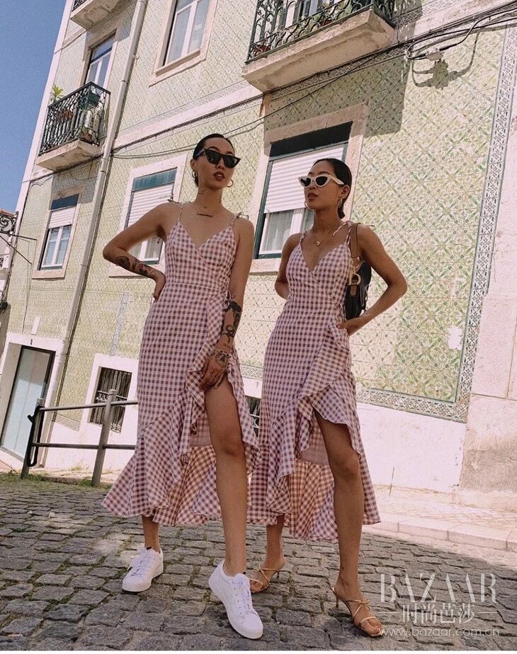 即使是一条一摸一样的裙子,也要在搭配上下“狠功夫”,不然只会让人觉得是两个穿着制服的店员出街午休。Dani Song和Amiee Song,两人虽然身着一样的格子开叉连衣裙,但是白球鞋的Dani是音乐节上的女孩儿风格,Amiee则是全然不同的法式优雅时髦。