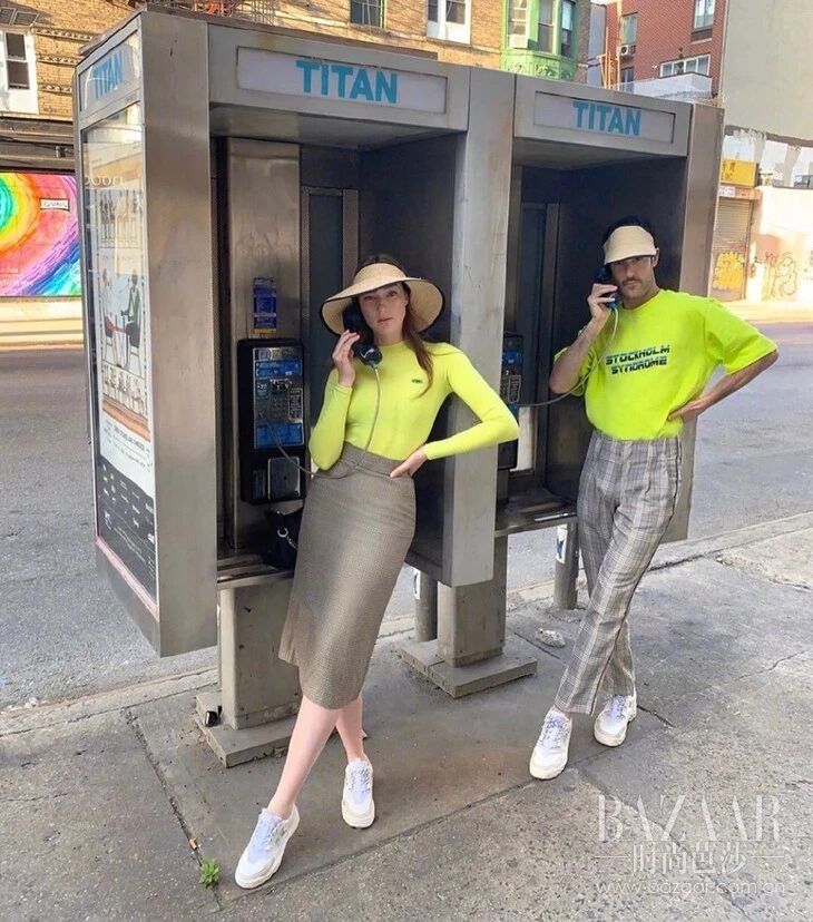法国情侣Nelson和Isabelle,选择今年热门的荧光绿,利用灰色的裤子和半裙很好的中和了荧光色带来的跳跃感,甚至连帽子这样的配饰细节都不放过,我怀疑他们两在共用衣橱!