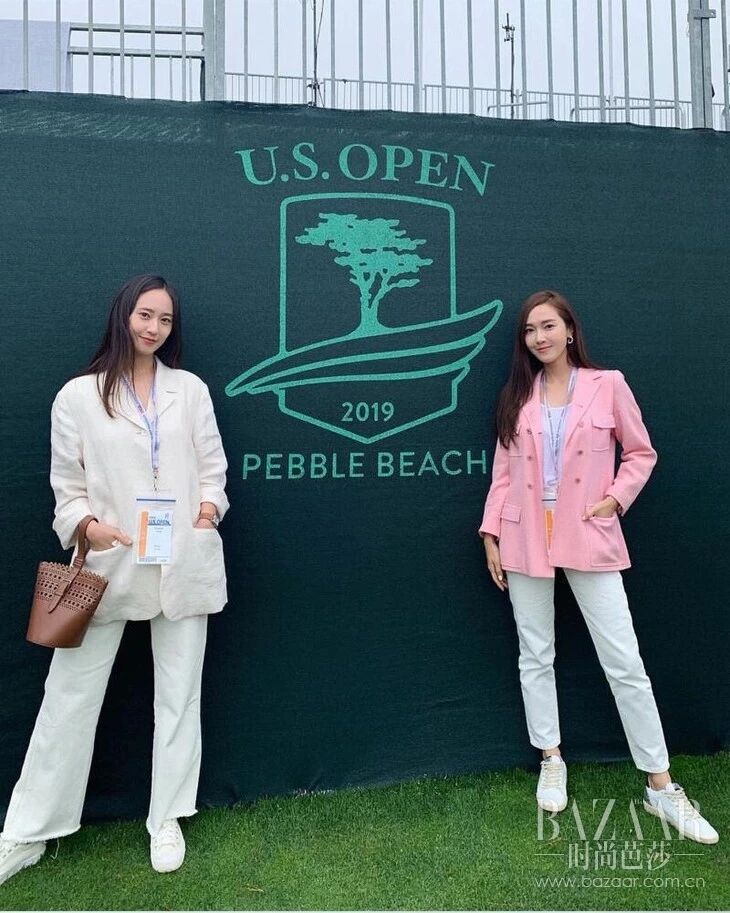 真姐妹Jessica和crystal每次姐妹装都轻松不做作,同样的休闲西装,通过不同颜色和不同剪裁的裤装,就能展现出两人不同的个性。