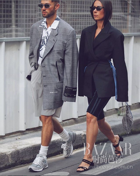 同样来自法国的情侣Alice Barbier和Js Roqus,两人虽然选择了不同单品,但是个个都在相互呼应对方的腔调。廓形西服外套,短裤与自行车裤子,略带科幻气息的墨镜,是一家时髦精没错了!