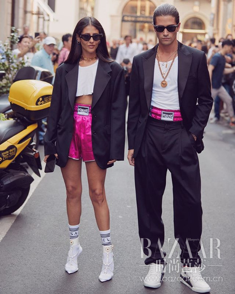 当然,风格相似的闺蜜装可以玩的更高阶,2019高定时装周外,博主Gilda Ambroiso与男闺蜜就心机的选择了非常高难度的玫粉色元素,但是同样都用黑白来平衡,显得有趣而且精彩。