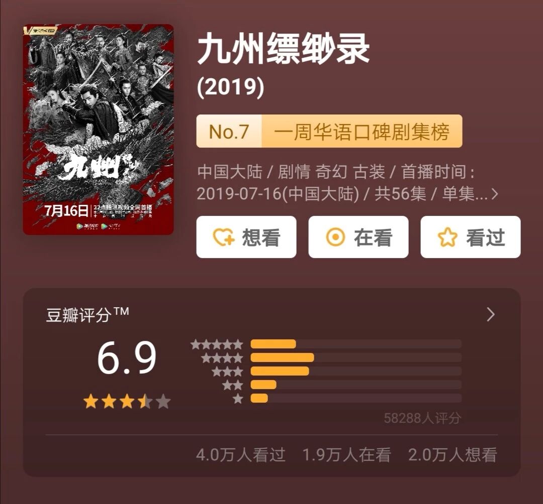 开播至今,《九州缥缈录》维持在豆瓣6.9的评分,近6万人参与打分。
