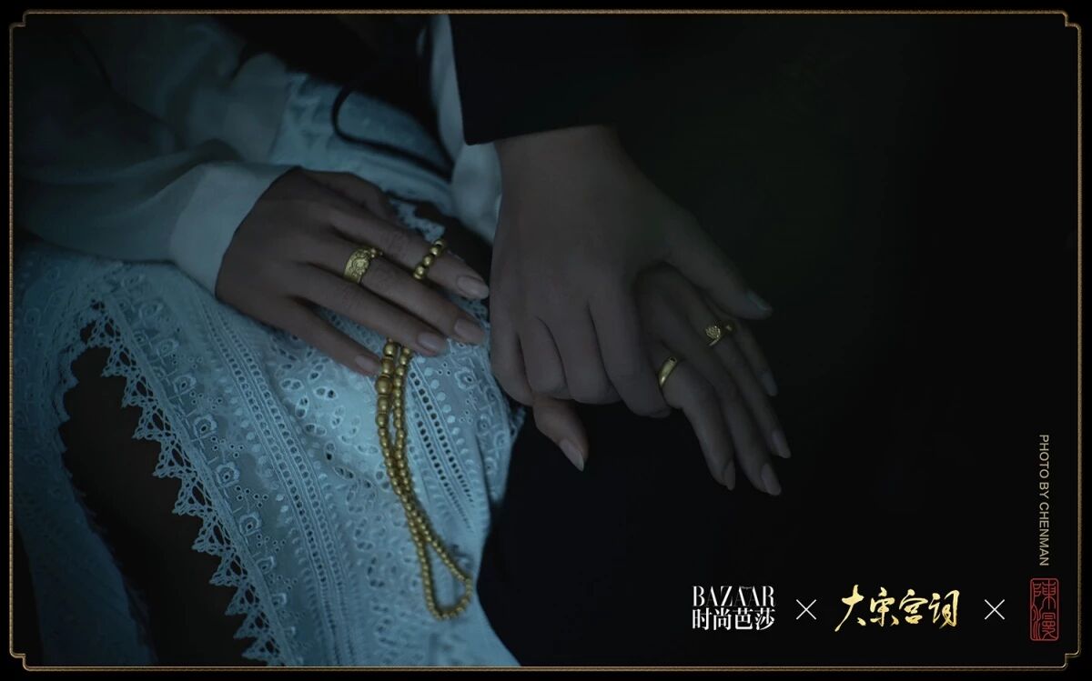 拼接礼服 Ralph & Russo 2019 F/W Haute Couture;平底鞋 73hours;云水龙凤对戒、红宝莲花镯、多宝金珠手串、南红灯笼珠手串 明牌珠宝传家金系列