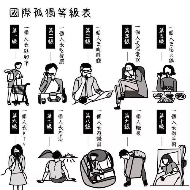 网上更有关于孤独的等级划分,从一个人逛超市、喝咖啡、吃火锅、看电影到最高等级一个人做手术。