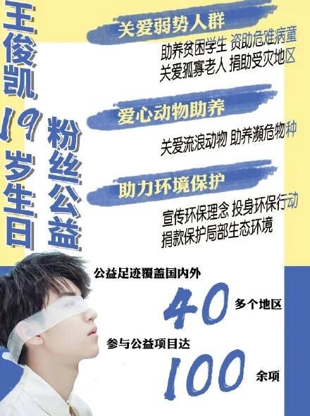在王俊凯19岁生日的时候,粉丝们没有送给王俊凯华丽的礼物,而是花了19万元做公益。其中包括给水污染严重的山区的孩子们送上干净的能喝的水;给500位不幸感染艾滋病的小朋友们,按照年龄和病情进行资助;关爱流浪动物,为流浪动物驿站捐赠猫粮狗粮……