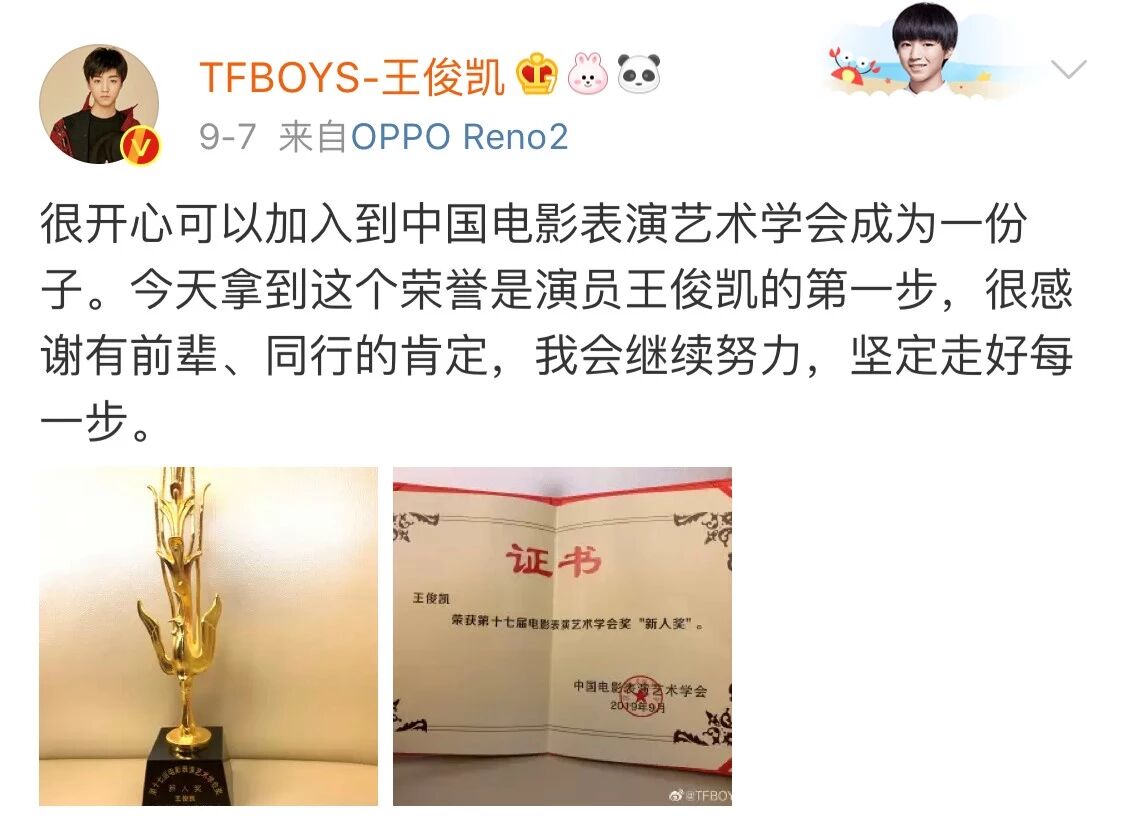 王俊凯也从来没有辜负过粉丝的期望,即使自己拿了奖也依旧不忘初心,一步一个脚印地的前行。努力钻研演技,认真对待学业。