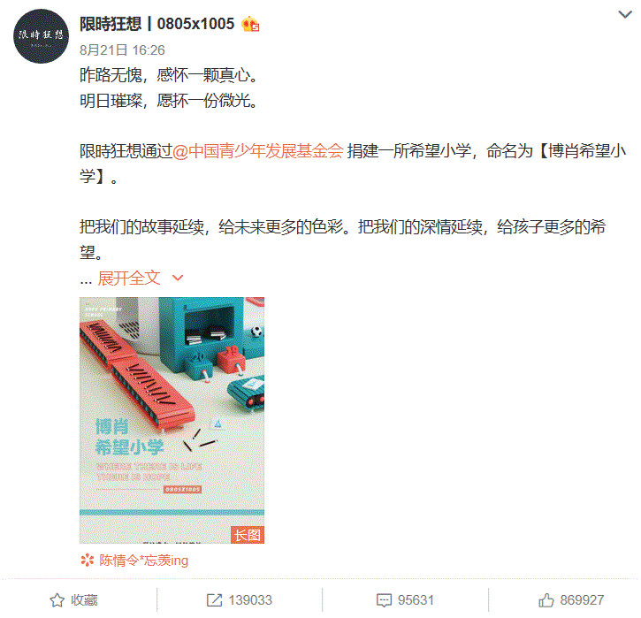 更有粉丝实力追星,肖战和王一博的粉丝就在微博发文“昨路无愧,感怀一颗真心。明日璀璨,愿抔一份微光。”以肖战和王一博的名字捐了一所希望小学。