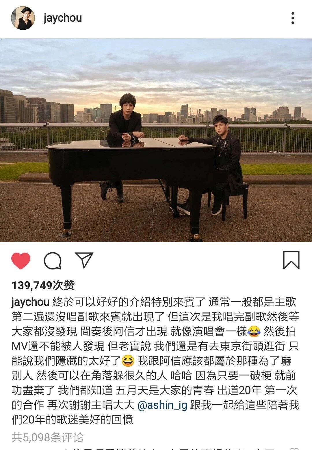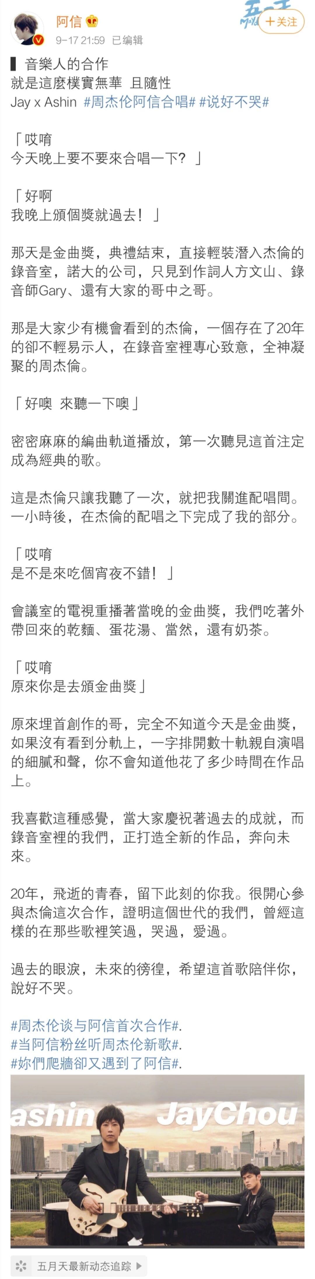 阿信和周杰伦还在社交平台上沾沾自喜,阿信更是po出细节——这首歌是在金曲奖颁奖那天录制的。
