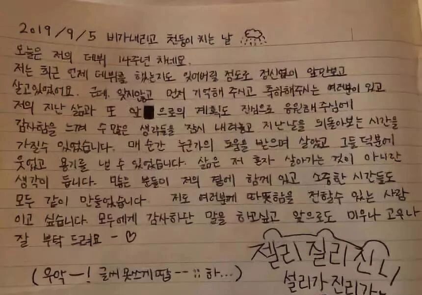 在出道14周年的手写信,写着“一点精神也没有,就只是看着前方前进。”“我也想成为给大家带来温暖的人”“想对所有人说声谢谢,以后也请多多关照。”