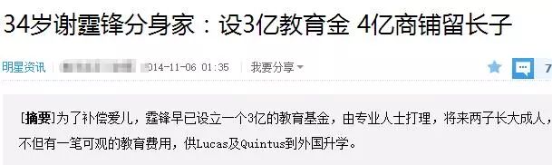 也曾有报道谢霆锋为孩子成立的教育基金,以及早已安排好给儿子留下的巨额财产