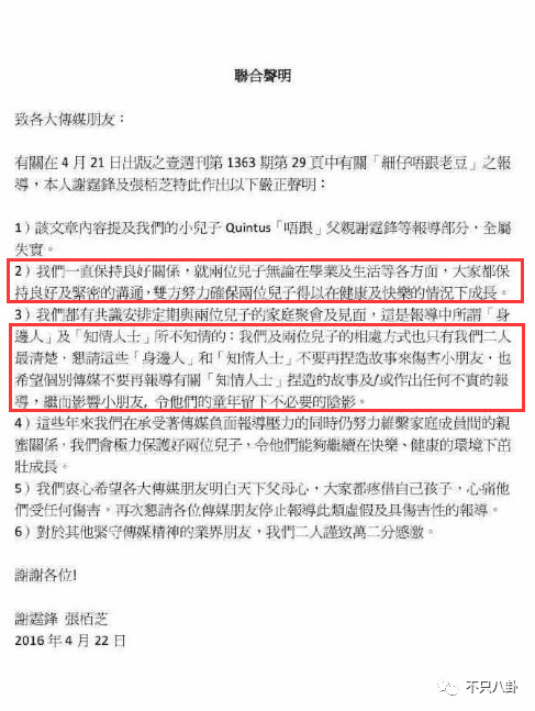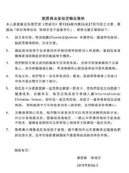 直到张柏芝带孩子去新加坡上学的事发生负面舆论,锋芝合体联手发声明