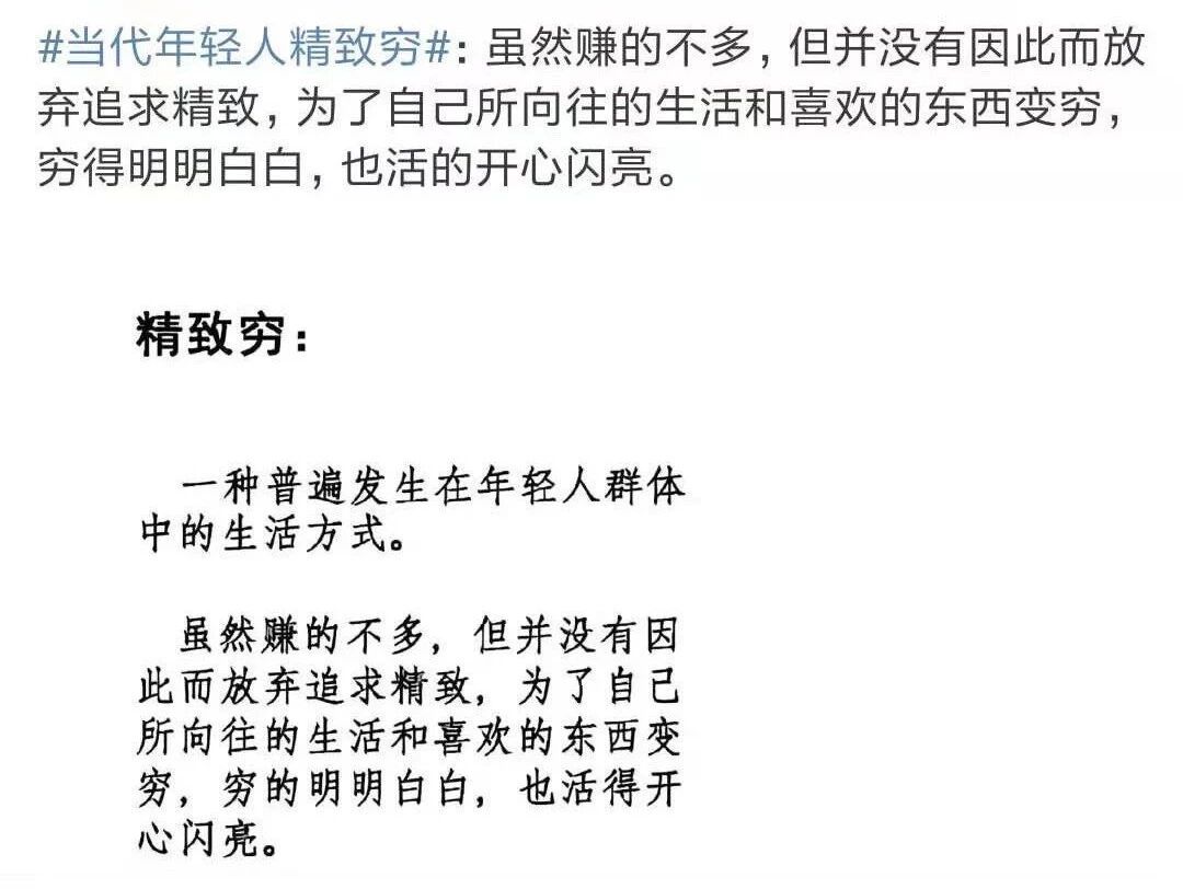 还记得当时,因为“精致穷”这三个字精简地概括了许多人当下的生活状态,于是新名词刚一出现,就引起网络上无数转发与阵阵热议