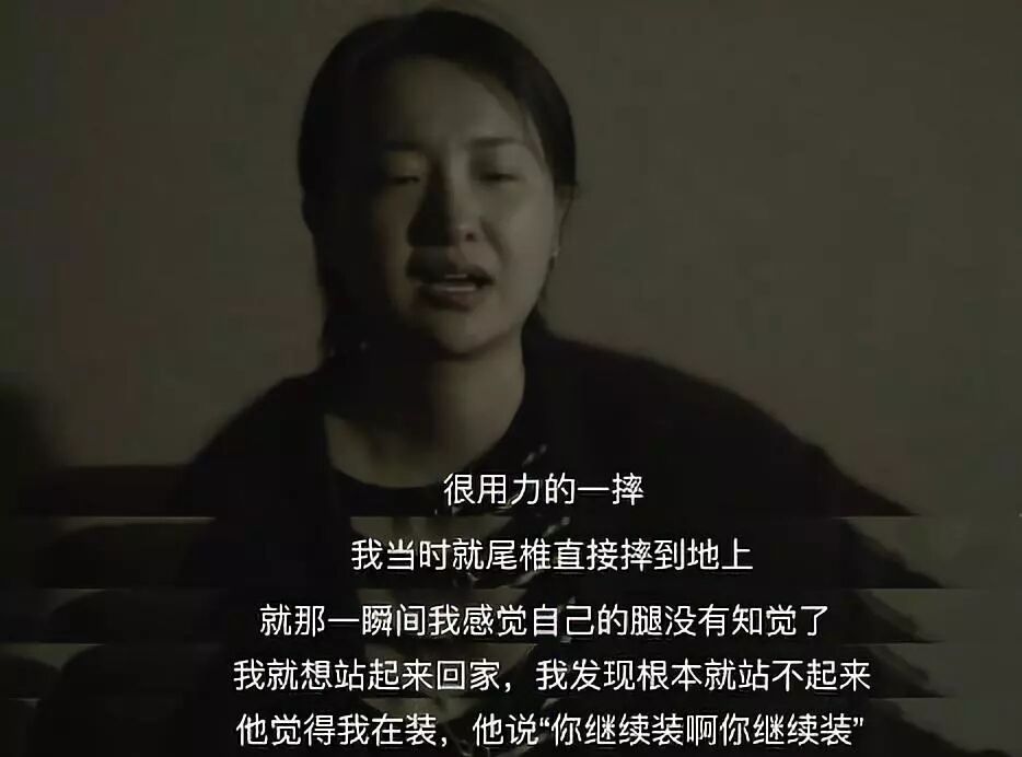 “他抓住我的肩膀使劲往地上一摔,很用力的一摔,我当时就尾椎直接摔到地上,就那一瞬间我感觉我自己的腿没有知觉了。我用手护着尾椎,不想他再踢我尾椎,在这个期间他把我在地上翻来覆去,用脚踹我的身体,不停的辱骂我,我不敢吭声不敢有任何反抗,我只能待在地上,让他把所有的情绪发泄完”
