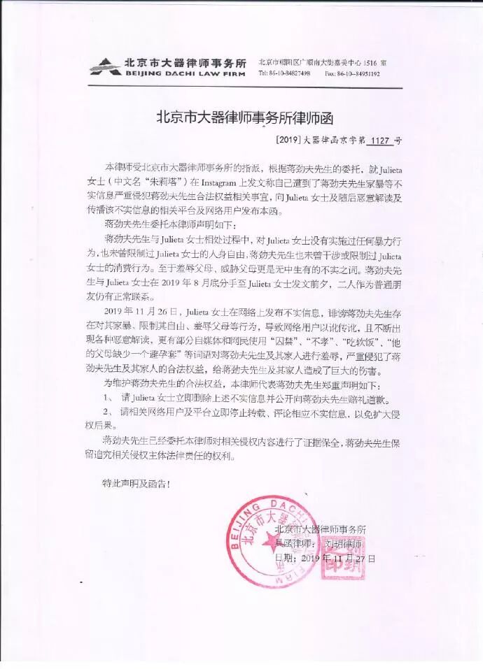 昨天蒋劲夫的代理律师发布了蒋劲夫的律师声明,称Julieta发布的不实信息侵犯了蒋劲夫的合法权益。