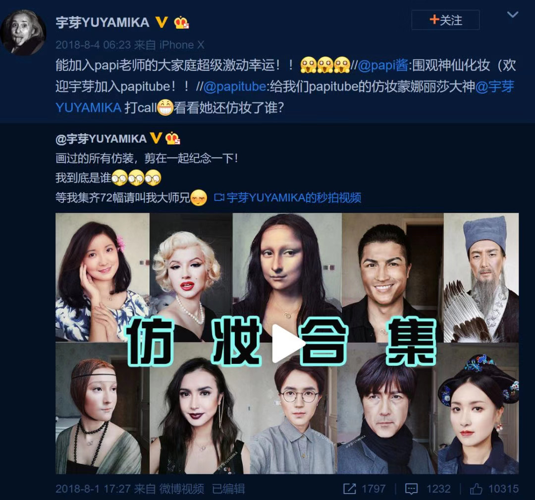 宇芽是个90后重庆女孩,2016年她开始在网络上分享自己的美妆视频,以令人惊艳的仿妆出名