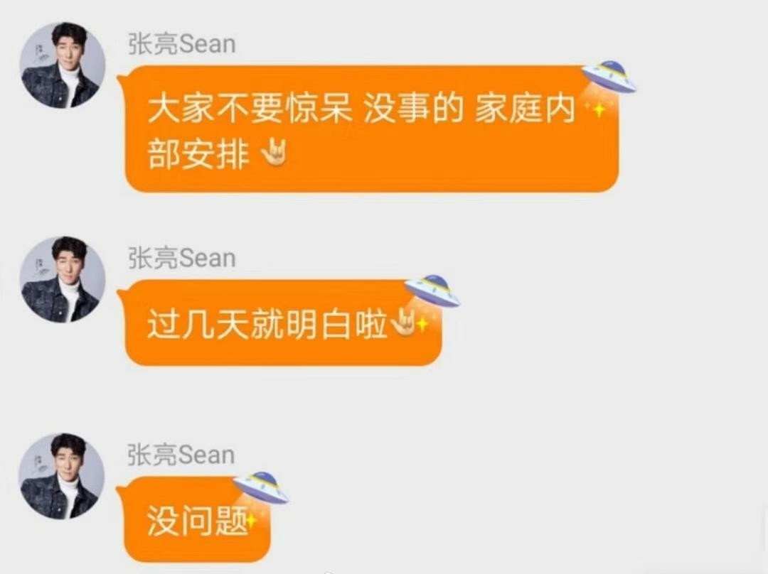 突如其来的官宣,让人震惊到满脸问号,而更让人费解的,就是张亮后来在自己粉丝群的回复,“大家不要惊呆,没事的,家庭内部安排,过几天就明白啦,没问题”