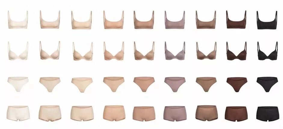 Skims系列包含内衣、三角裤、紧身衣和平角裤等,9种深浅不一的大地色,可以满足不同肤色消费者的各种需求。