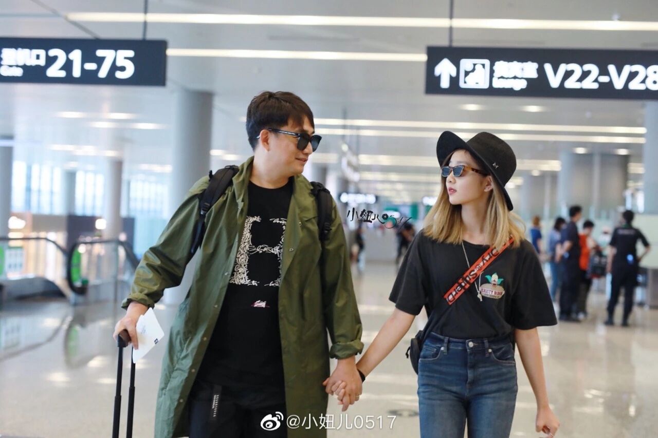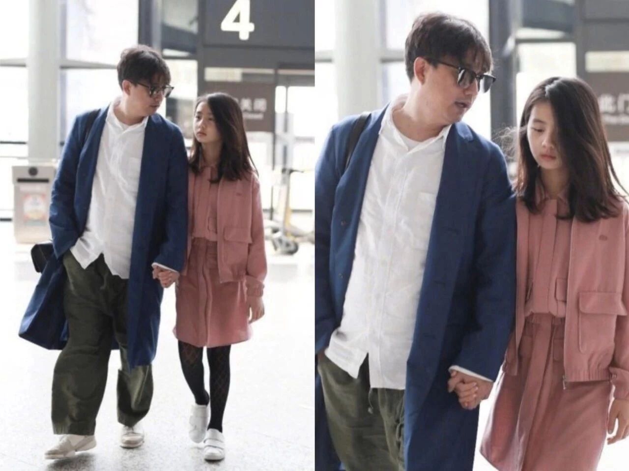 某次和黄磊一起走机场,年仅13岁的她,个头儿都快要赶上了旁边的老爸