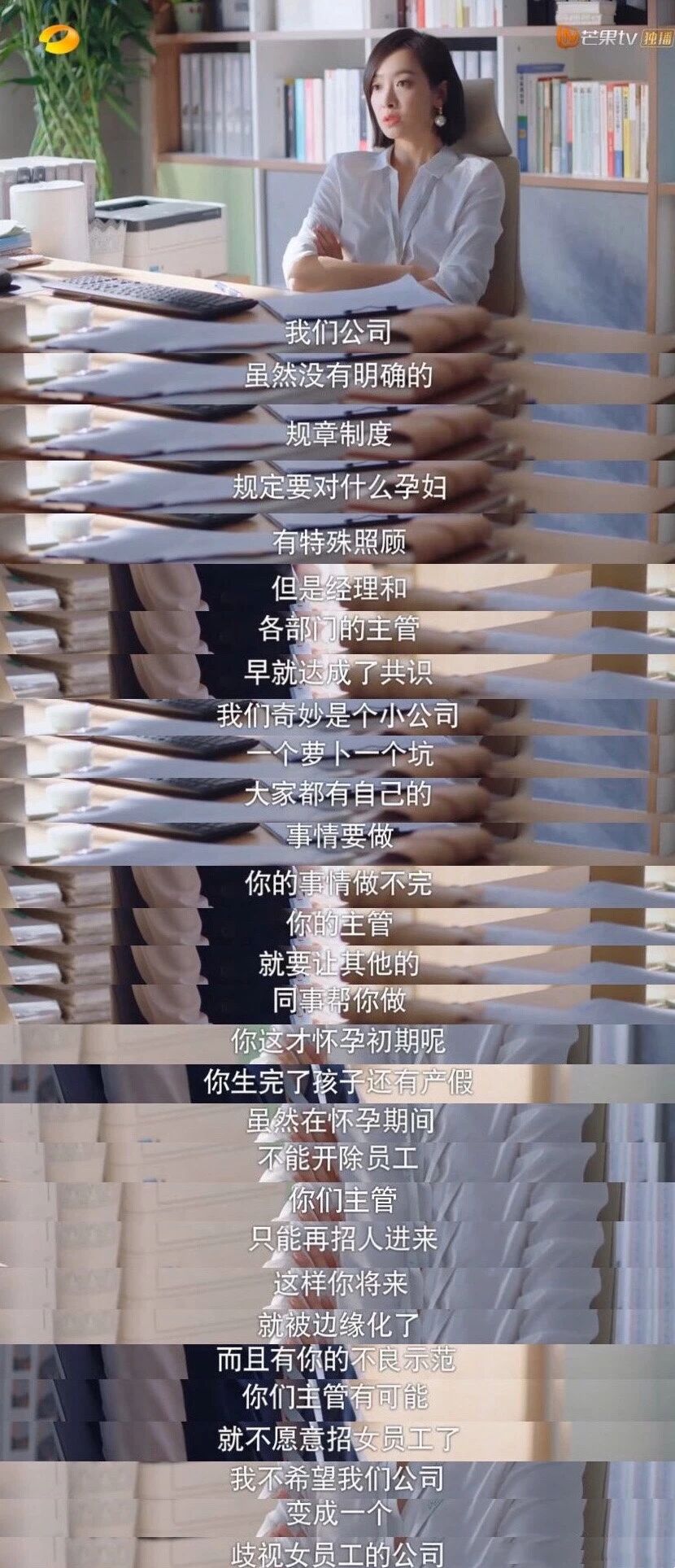 还通过贺繁星身为主管在职场上对怀孕员工的谈话,表达了对女性在职场上应有的态度以及希望保持的状态。要想公司不变成歧视女员工的公司,就不要把自己当作个例,做好自己本可以做好的工作。
