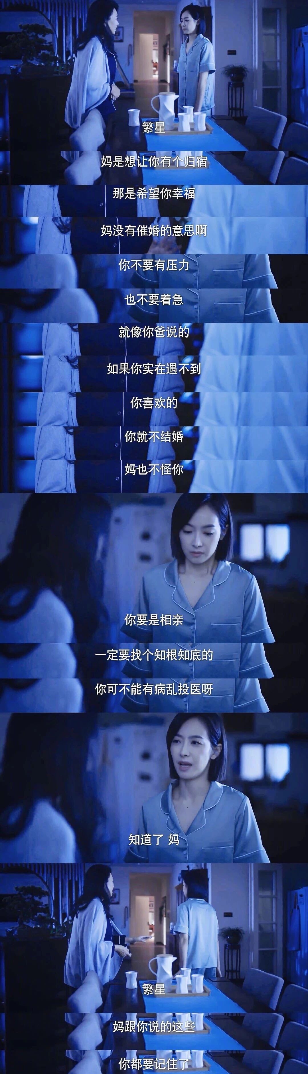 贺繁星的父母足够开明也足够理智,不催婚,尊重女儿的单身状态,帮她顶住所有来自亲戚朋友邻居熟人的非议和压力。给繁星足够的自由、爱和最宝贵的支持。