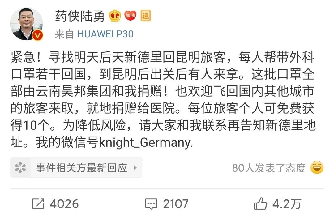 2月1日,他再次发文寻找新德里回昆明旅客,期望每人帮带外科口罩若干回国;口罩全部由云南昊邦集团和陆勇本人捐赠,也欢迎飞回国内其他城市的旅客来取,每位旅客个人可免费获得 10 个。