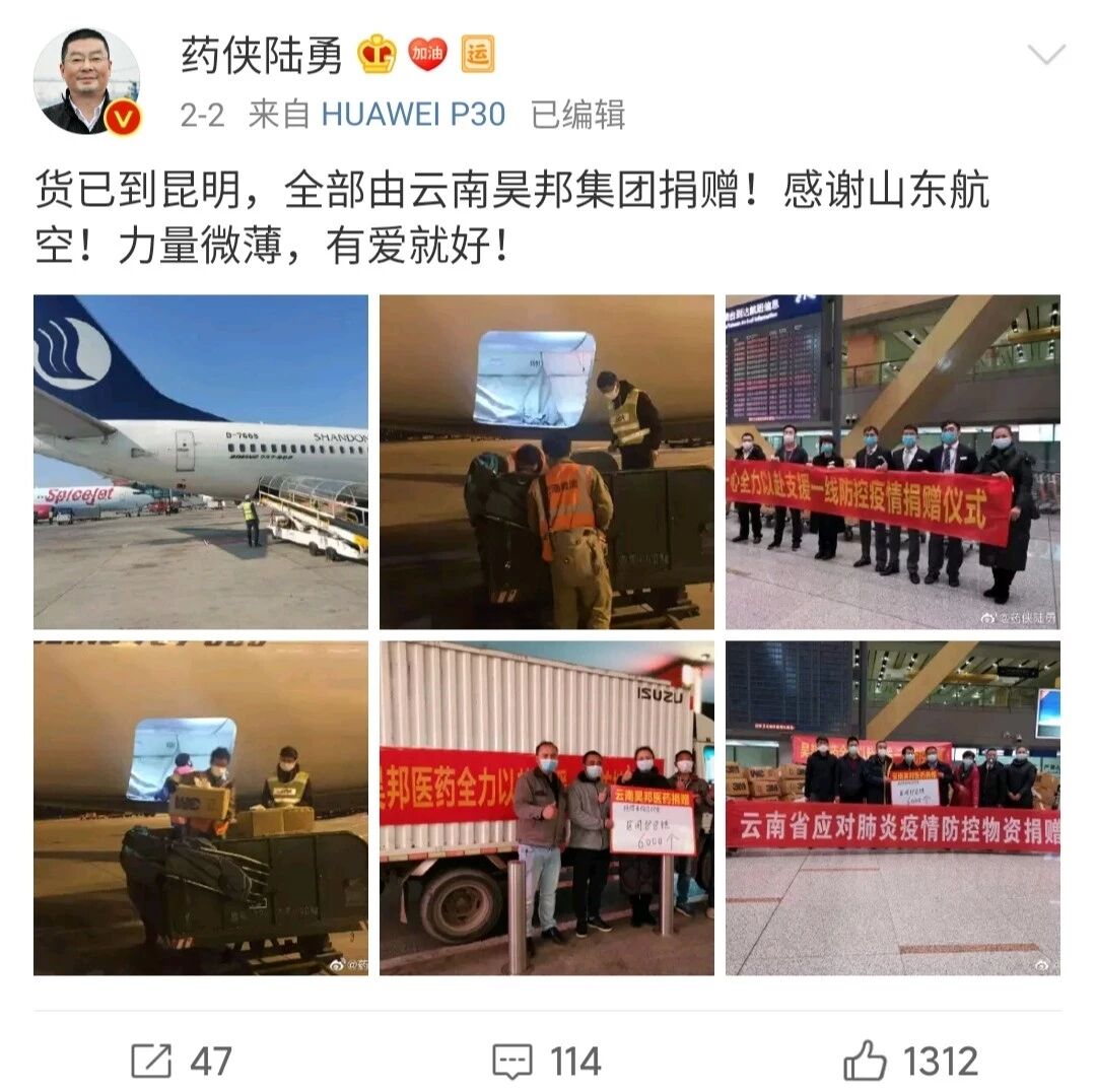 2月2日,陆勇发文称,“只要平凡,就是生活。愿这是电影,而不是生活;愿三轮车里不是抗疫物资,而是苹果。”晚22时22分,他表示物资已到达昆明。