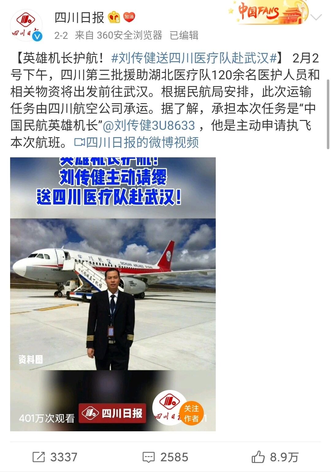 自新型冠状疫情防卫战开始后,不仅民众降低了出行次数,不少公共交通也减少了班次,但是为疫情防卫前线保驾护航的工作没有停止。2月2日17点10分,四川第三批援助湖北医疗队抵达武汉,而承担本次任务的是“中国民航英雄机长”、电影《中国机长》的原型刘传健。