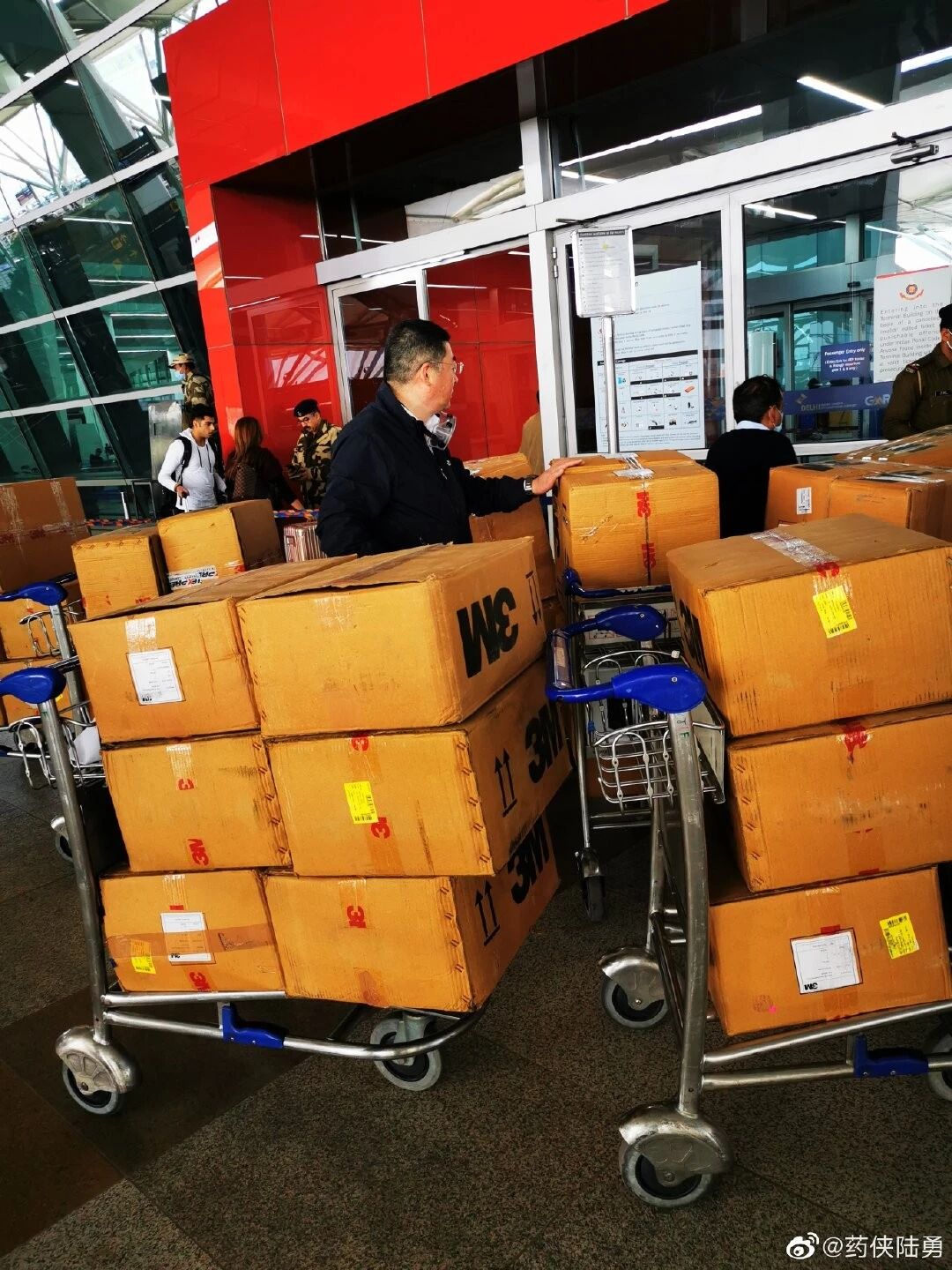 1月31日,陆勇在其社交账号发文称,自己和云南大学印度研究院柳老师初五到印度,筹措了3000个护目镜,3000个N95口罩。这49箱物资是他坐着货运三轮到机场,并打包发回国内,用以支援在前线抗击疫情的医护人员。