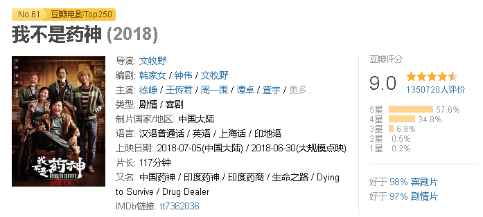 由真实事件改编而来的《我不是药神》在2018年度电影市场中占据了重要的一席之地,超135万人评价的豆瓣9.0高分或可窥见一二。