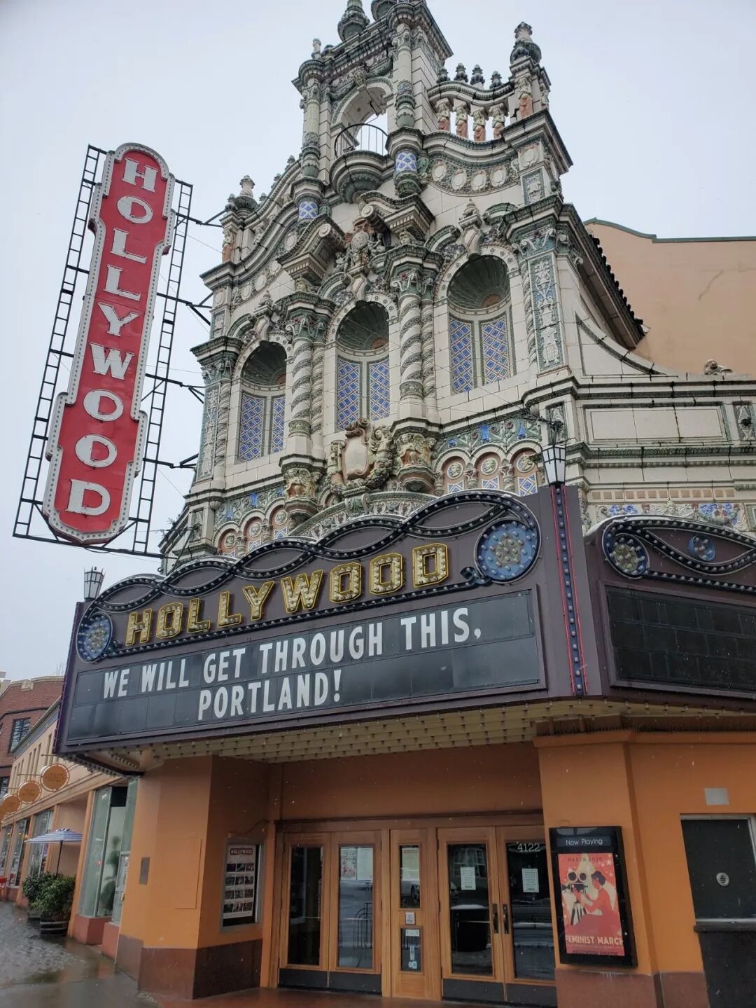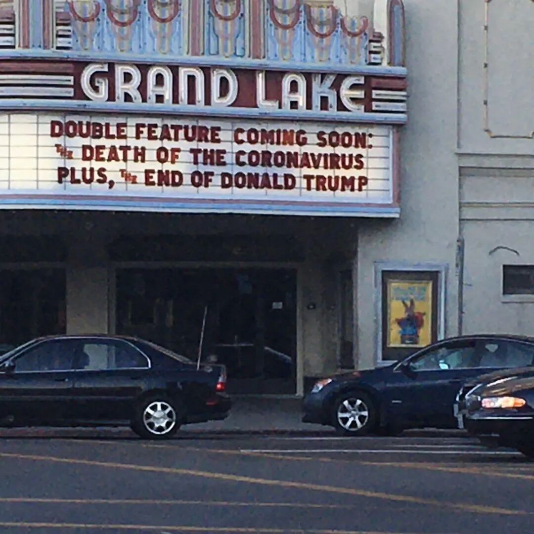 另外,美国加利佛尼亚州的大湖影院(Grand Lake Theatre)也是一家从1926年营业至今的历史悠久的影院,它家的广告牌用戏谑的表达传递着当下最迫切的“祈愿”: