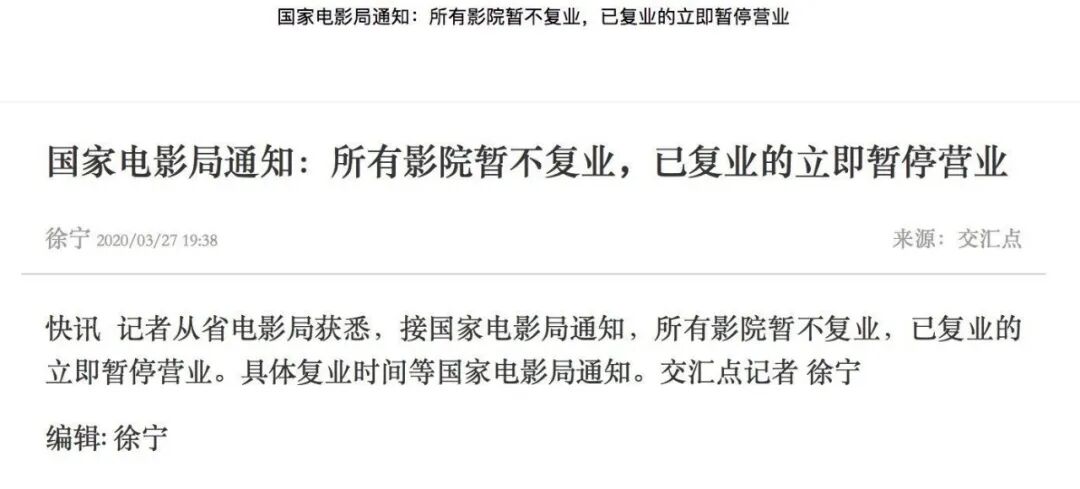 所有影院暂不复业,已复业的影院立即暂停营业,具体复业时间待通知。