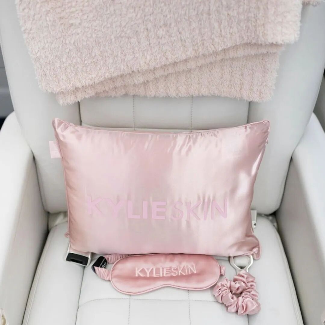 而更高能的营销手段还在于凯总带着Kylie Skin的家人团建之旅,包下私人飞机,不仅飞机外观上Kylie Skin的粉红字样,飞机内舱中的枕头、眼罩等都有品牌Logo的刺绣。