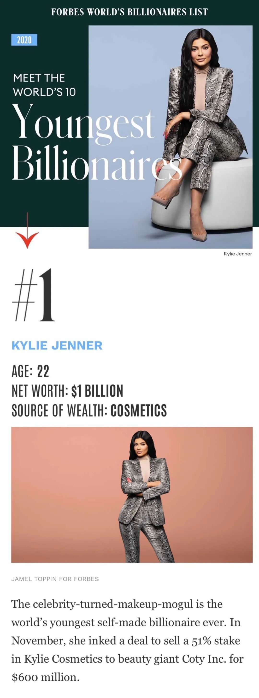 2019年3月5日,福布斯发布第33期年度全球亿万富豪榜,Kylie Jenner首次上榜,排名为第2057位,成为全世界最年轻的亿万富豪