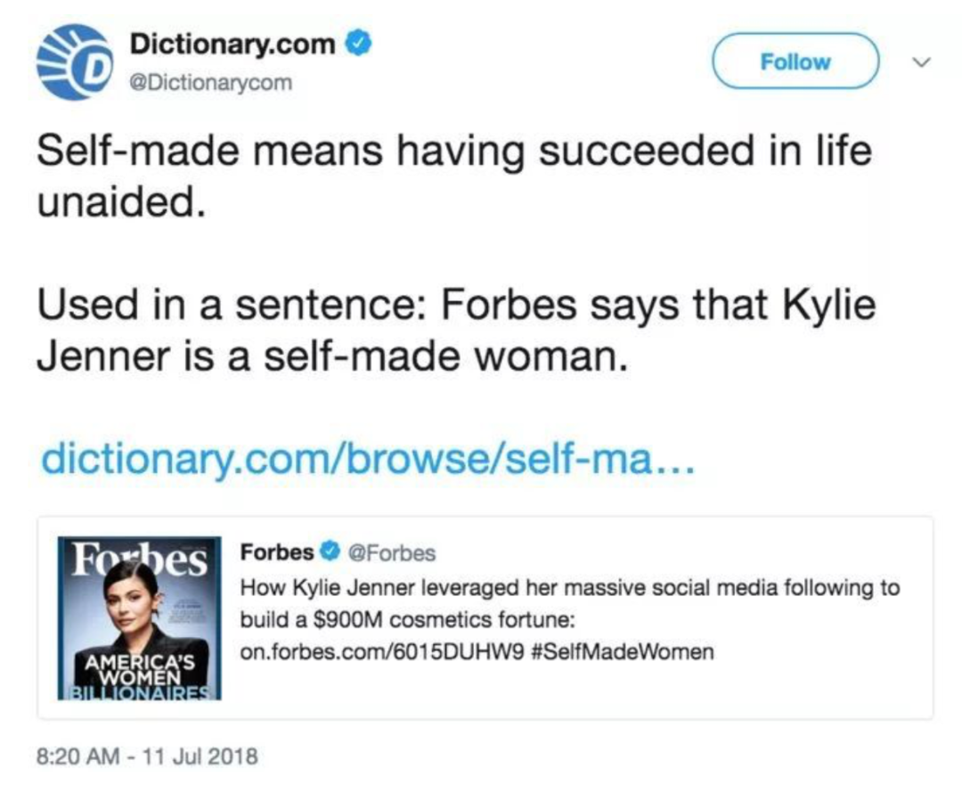 Dictionary.com也来蹭了这场全球最年轻亿万富豪的热度,发推特说:Self-made意味着在没有人帮助的情况下成功了