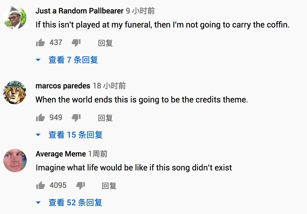 “如果我的葬礼上不播放这首歌,我就要闹了”“如果世界终结了,这首歌应该做片尾曲” “我无法想象我的生活里没有这首歌”