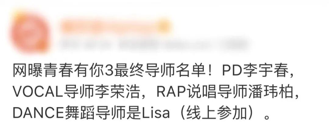 而目前曝光的这导师阵容来看,也基本对得上之前网传的《青春有你3》导师名单——青春制作人李宇春、音乐导师李荣浩、舞蹈导师Lisa与Rap导师潘玮柏。