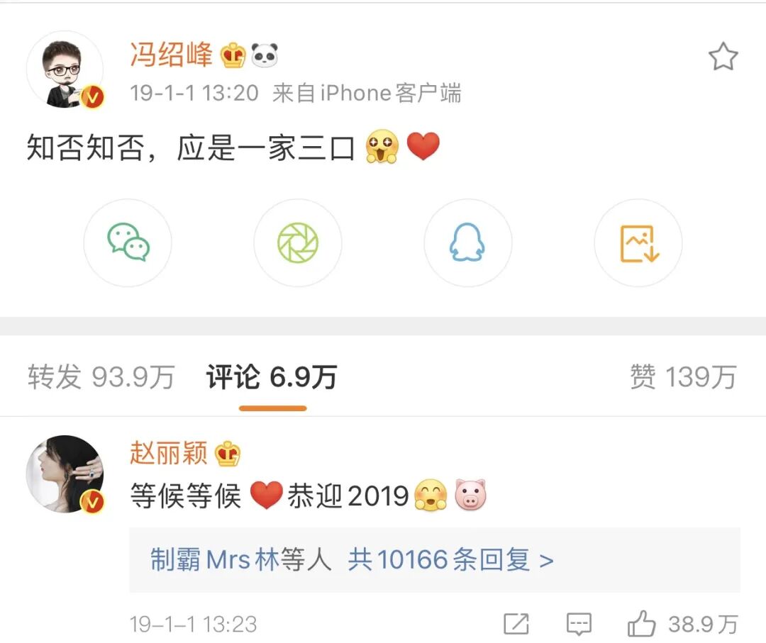2019年1月1日,冯绍峰发文正式宣布赵丽颖怀孕喜讯,“知否知否,应是一家三口”。