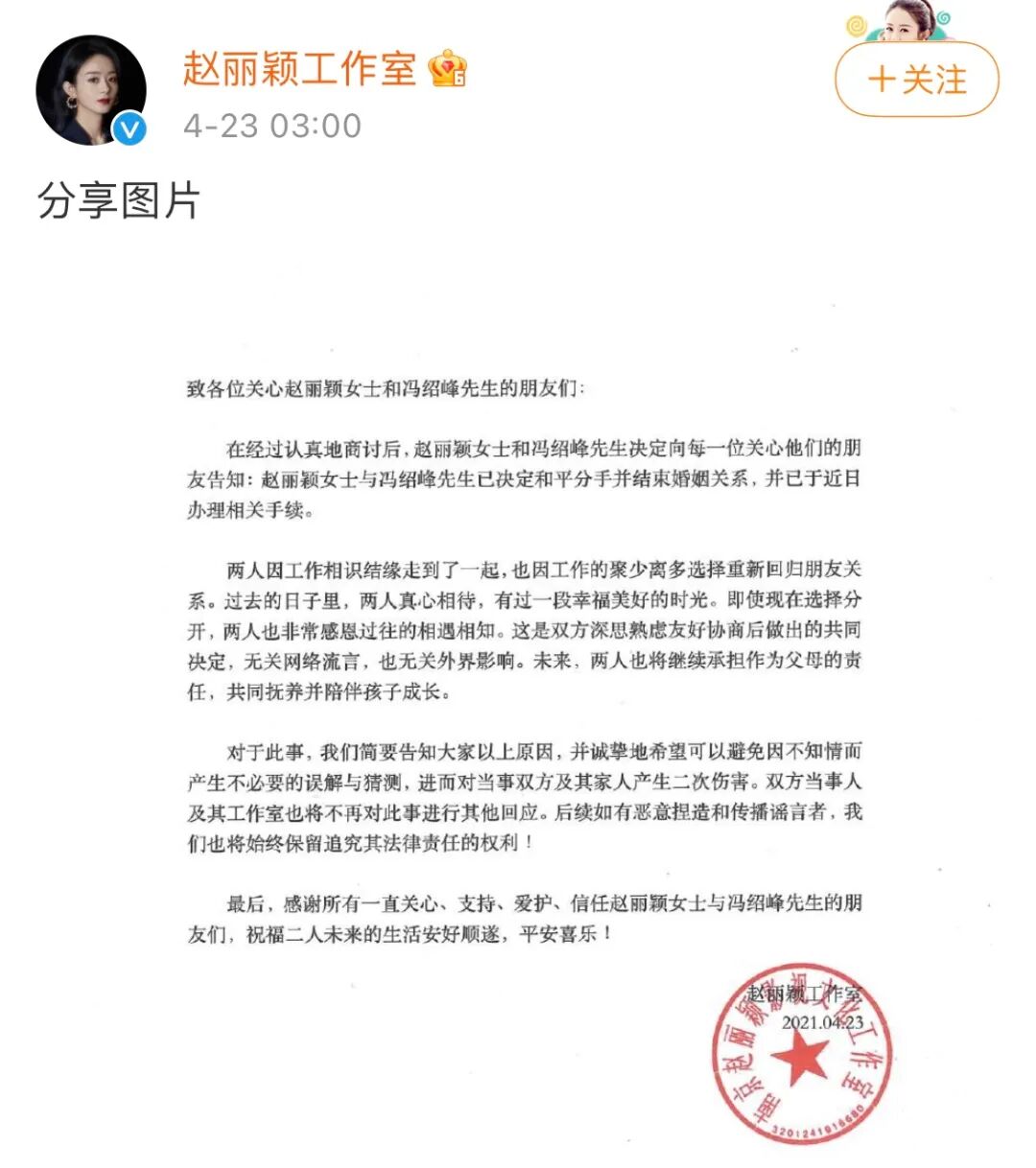 “在经过认真地商讨后,赵丽颖女士和冯绍峰先生决定向每一位关心他们的朋友告知:赵丽颖女士与冯绍峰先生已决定和平分手并结束婚姻关系,并已于近日办理相关手续。