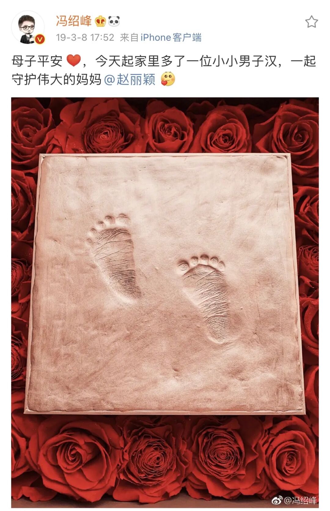 时隔不到俩月的时间,2019年3月8日,冯绍峰再次发文宣布妻子赵丽颖产下一子。