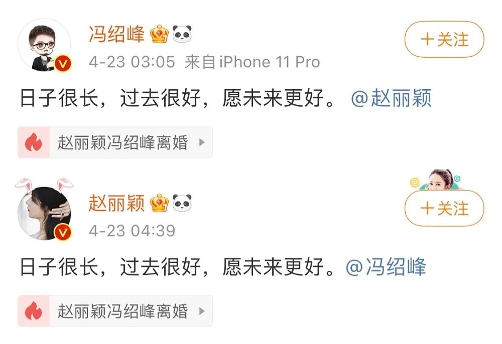工作室声明发出五分钟后,两位事件当事人也在个人微博上确认了离婚消息属实。