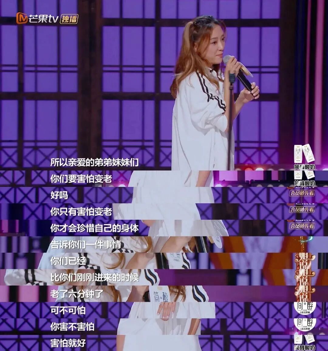 在这期《听姐说》里,应采儿唱了一次反调,选择“不要害怕变老,太可笑了”的主题,称“只有害怕变老,你才会珍惜自己的身体”。