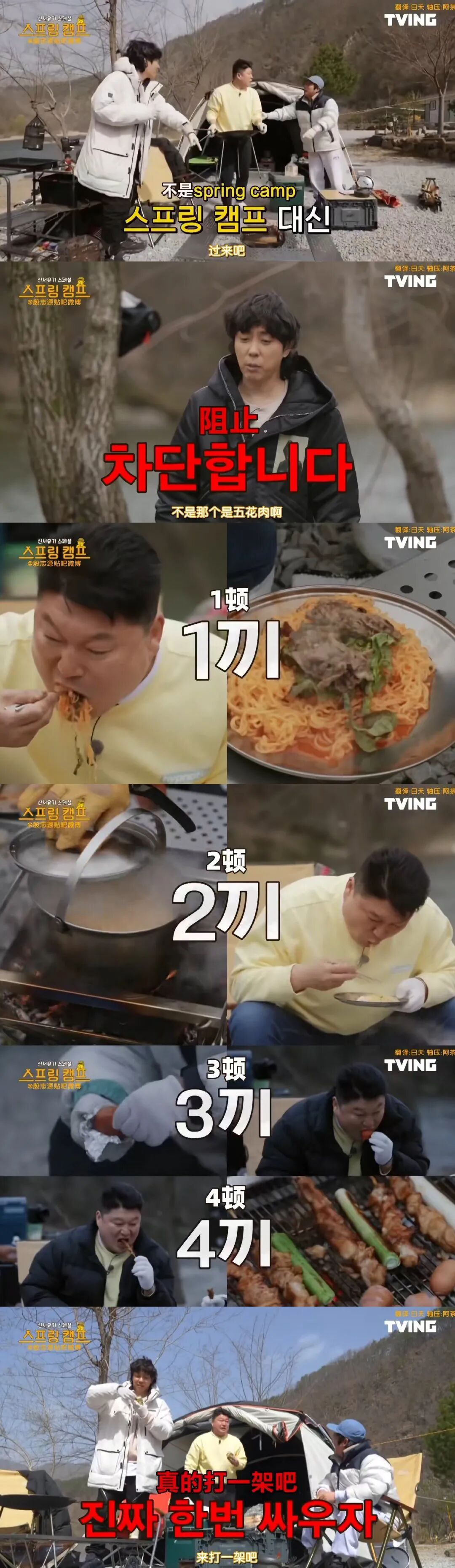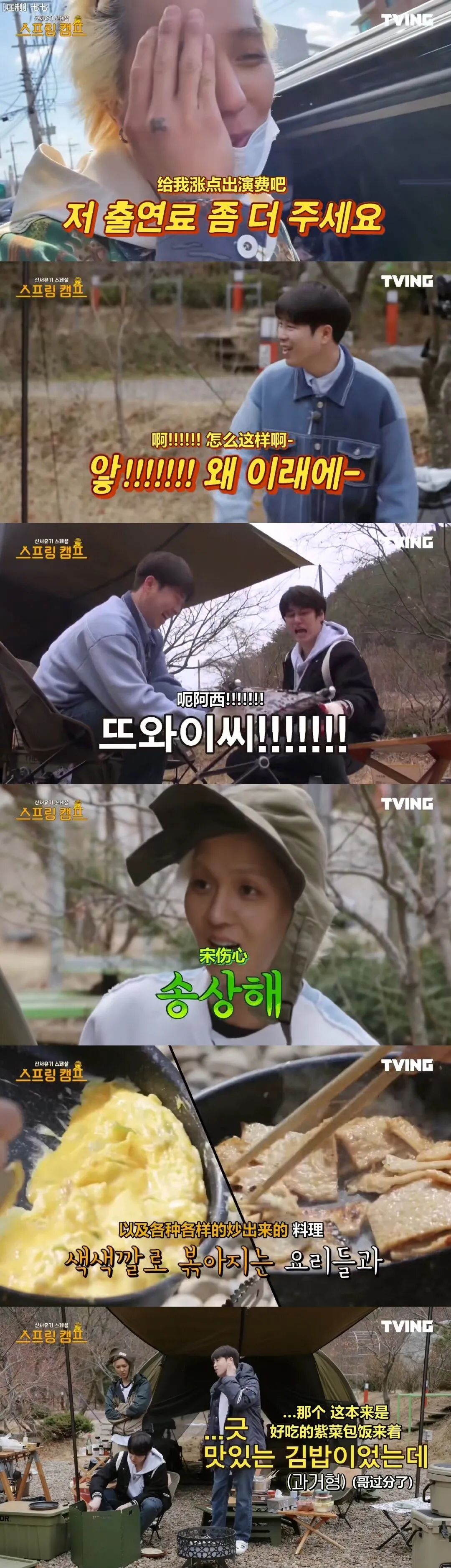 突然出现在露营地旁边的时候,不只观众,连圭贤、宋旻浩、P.O都瞪大了双眼,完全没想到安安能回归节目。