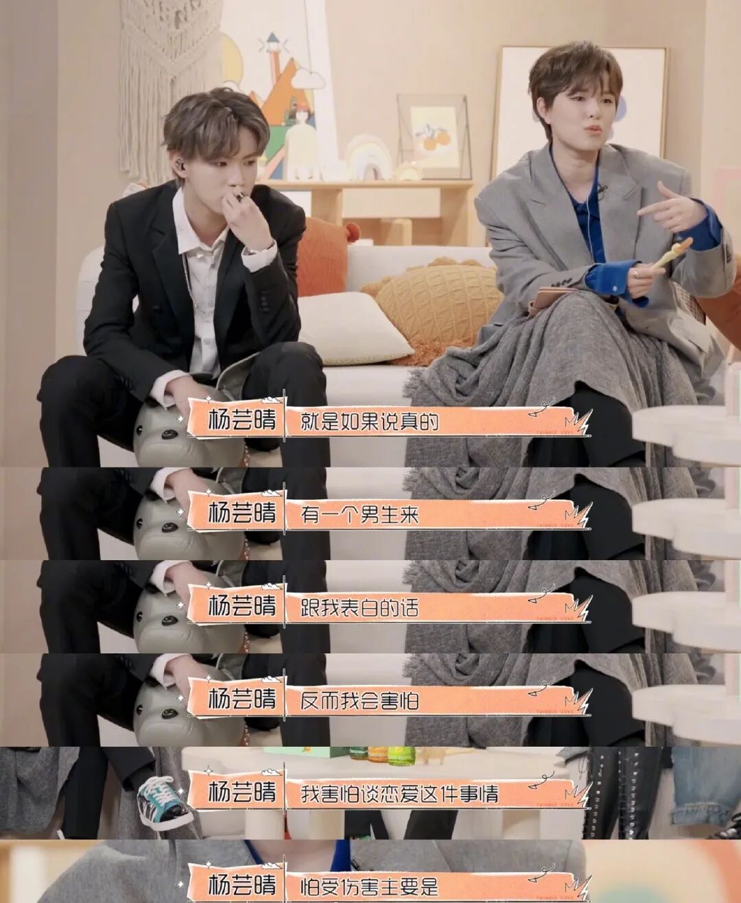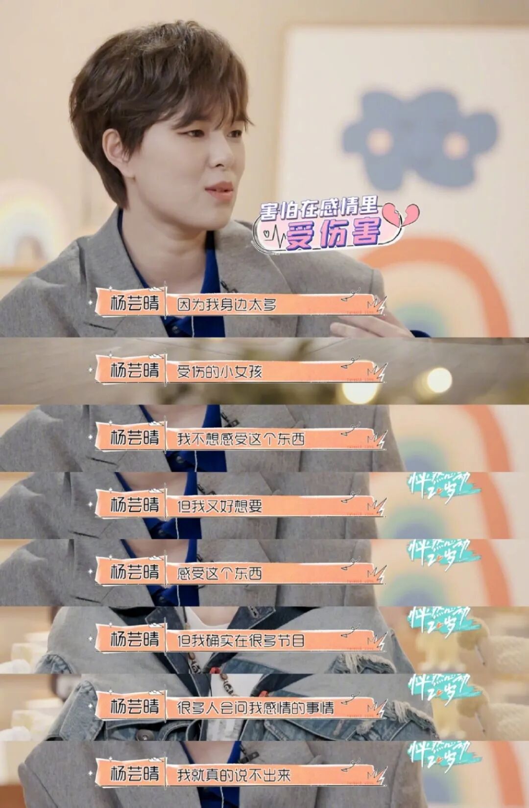 “因为我身边太多受伤的小女孩,我不想感受这个东西,但我又好想要感受这个东西。确实在很多节目中,很多人会问我感情的事情,我就真的说不出来。”