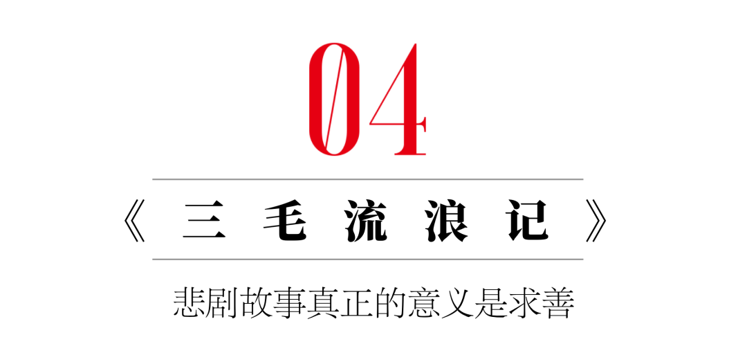 小时候我们看懂的是故事,长大后我们回看的是有具体的人在承受的一段历史。《三毛流浪记》展现的是黑暗面,但是却并没有宣扬这种黑暗。悲剧引起的恐惧与怜悯,它真正的意义是求善。人性的恶越是被展露,孩子们心中对善的追求越能被激发。童年对一个人的影响是深远的,它带给孩子们对复杂世界的苦难更多层次的理解力。